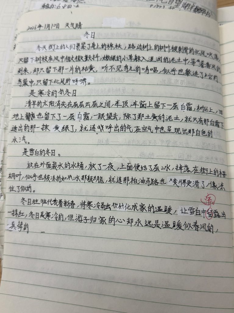 冬天街上的人们裹紧了身上的棉袄,路边树上的树叶被刺骨的北风吹落,只留下树枝在风中微微颤抖,嫩绿的小草躲入湿润的泥土中,等着春风的到来,却只留下那一片的枯黄,听不见鸟儿的鸣唱,似乎也躲进了它的鸟巢中,只留下北风的呼啸。 是寒冷的冬日。 清早的太阳消失在层层云层之间,车顶、车窗上留下一层白霜,树丛上,田地上、栅栏也留下了一层白霜,一眼望去,除了那土黄的泥土,就只有那白霜下透出的那一抹黄绿了,就连呼出的气在空气中也呈现出那白色的水汽。 是雪白的冬日。 放在外面装水的水桶,放了一夜,上面便结了层冰,掉落在街上的梧桐叶,似乎也被冻的如冰那般脆,就连那柏油马路也变得更滑了,像冻住了似的。 冬日往往代表着新春,将寒冷出去,村化成家的温暖,让雪白中显露出一抹红,冬日是寒冷的,但游子归家的心却永远是温暖似春风的,真挚的 。
